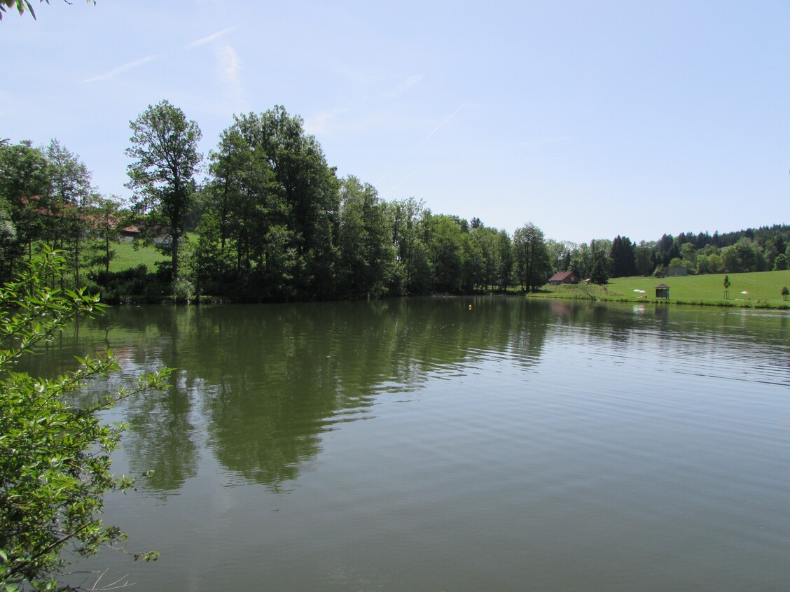 Blick von der kleinen Straßenbrücke auf den Schachenweiher und die Liegewiese am Ufer.